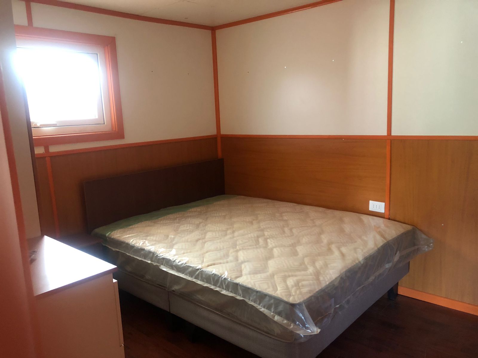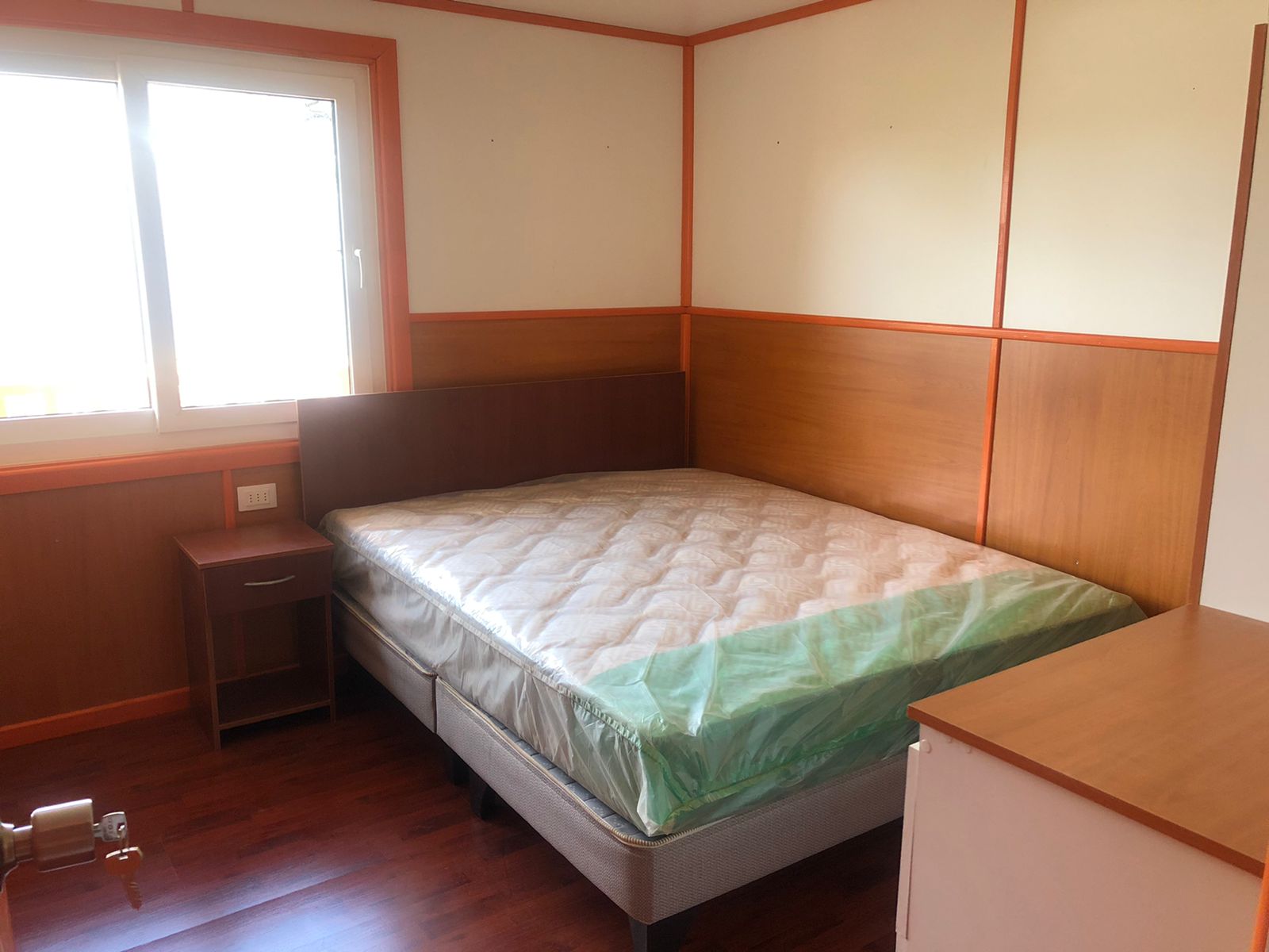 Entrada con portón y reja, living comedor, cocina americana amoblada (con loza y ollas), cocina a gas con horno, extractor, refrigerador, baño completo con ducha, 2 dormitorios con closet, cama y velador (el segundo dormitorio es más pequeño).