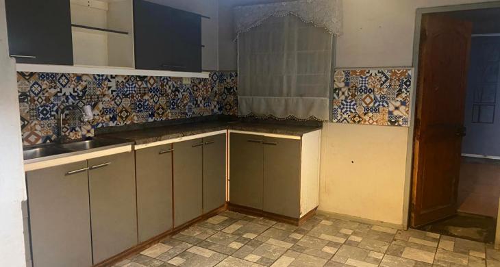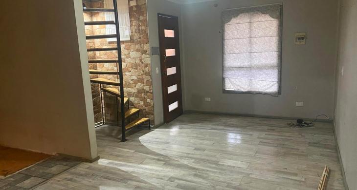 Ante jardín con reja, estacionamiento, living, comedor, cocina con muebles empotrados, baño completo con cerámicas.