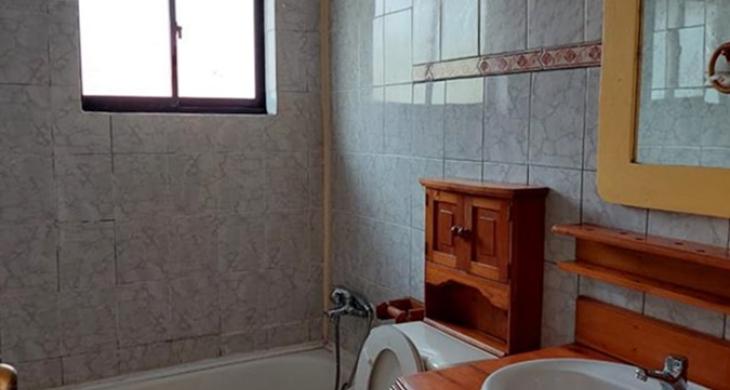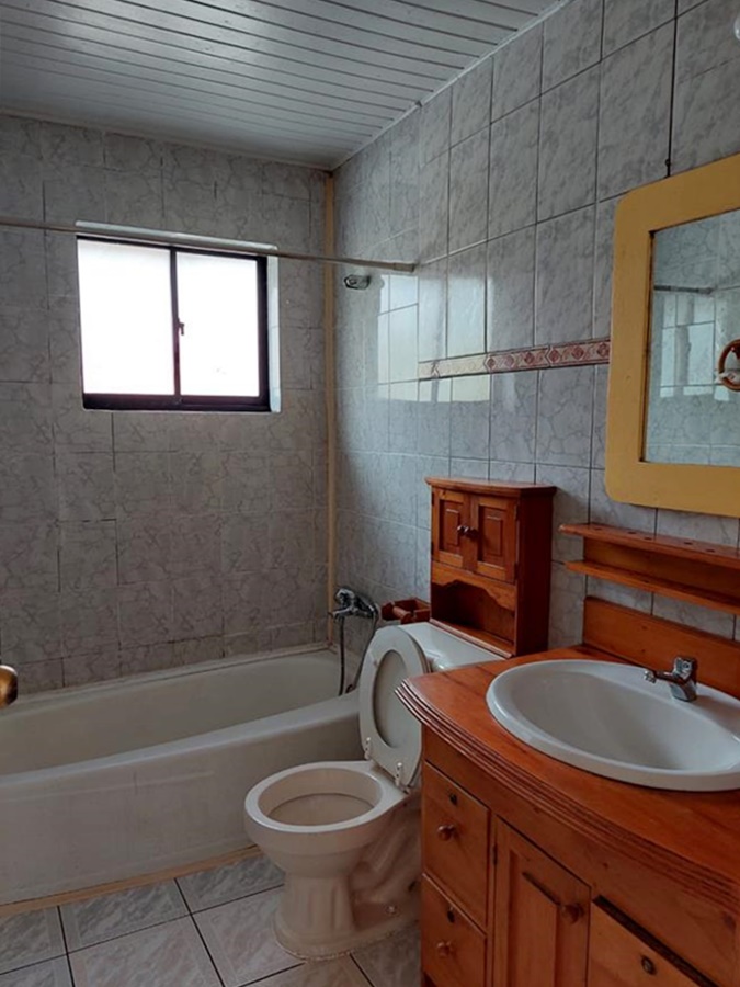 Un baño completo, muy buen tamaño con tina y ducha, con ventana con ventilación natural y mueble en el lavamanos.