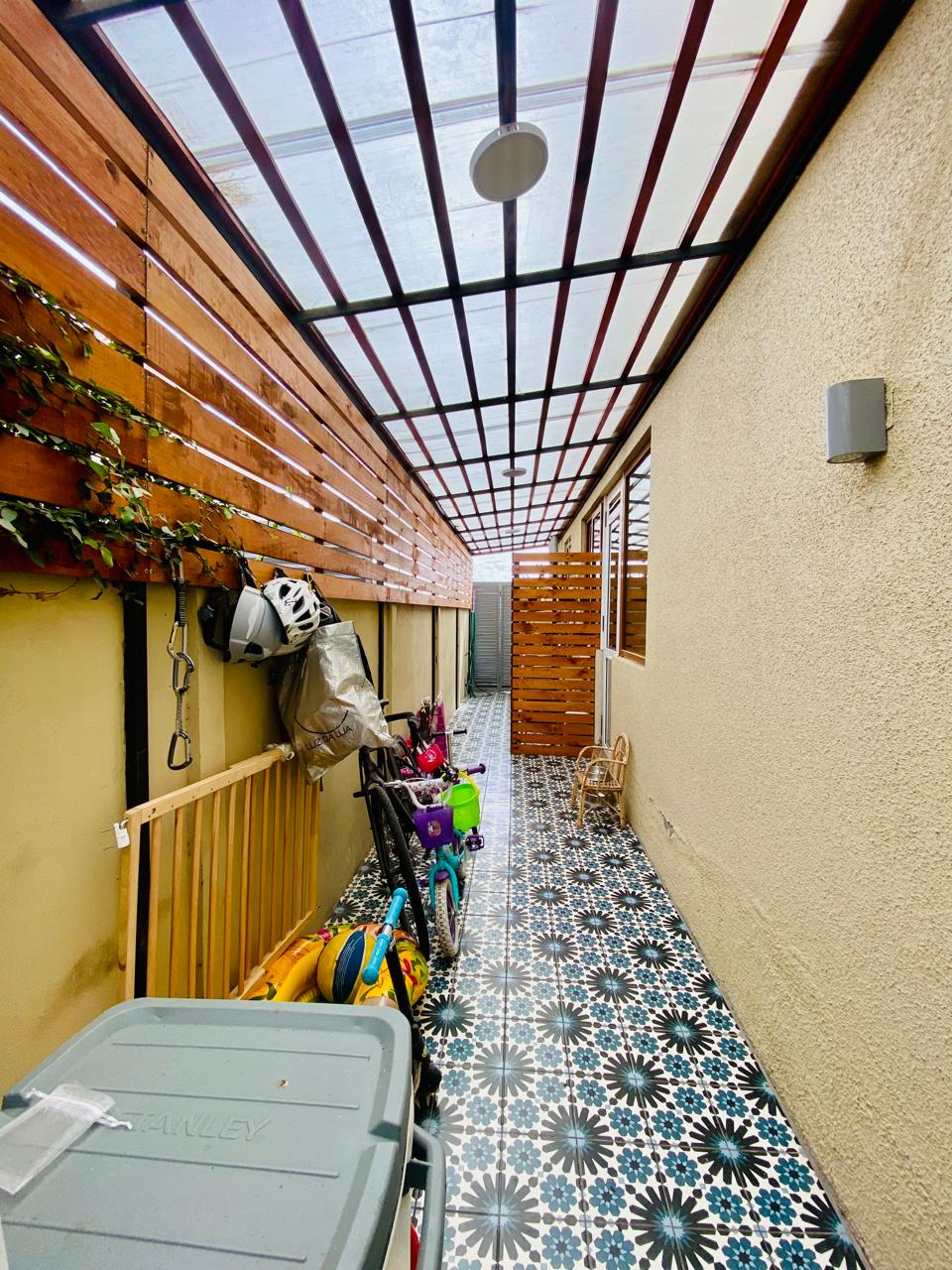 Amplia terraza techada con cielo con vigas de madera a la vista, creando el ambiente perfecto para tus reuniones o simplemente para descansar.