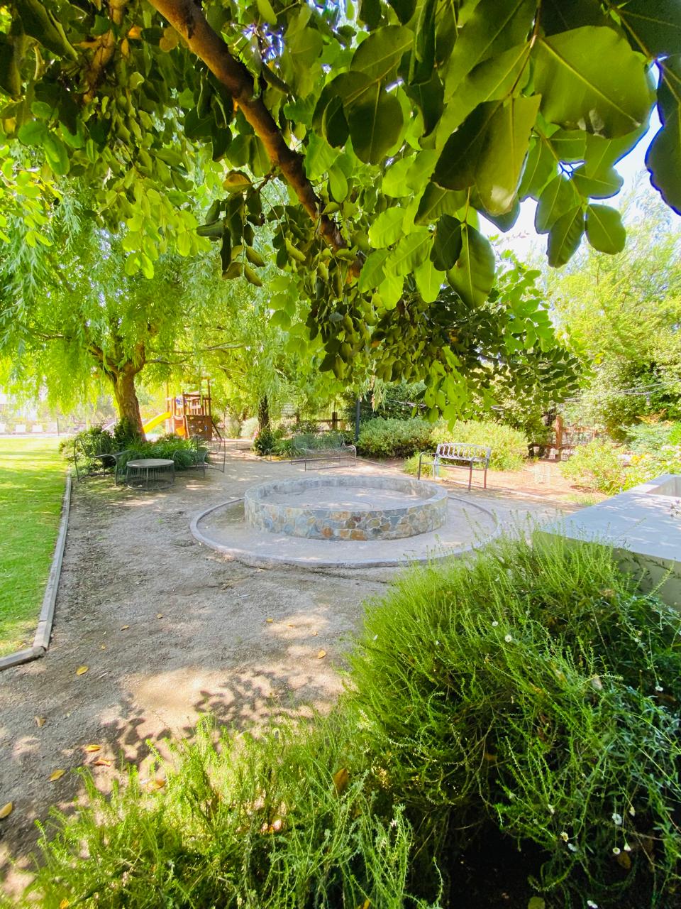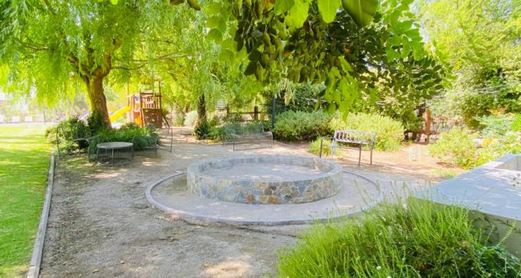 El jardín incluye juegos infantiles de madera (playhouse) y una cama elástica a nivel de piso, integrados armoniosamente al paisajismo.