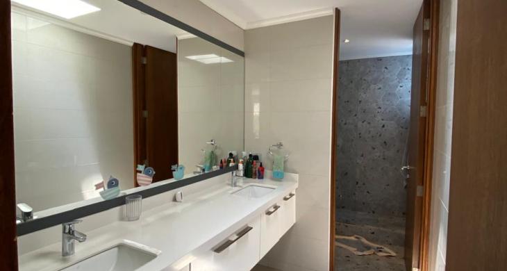 Relájate en un baño tipo spa con jacuzzi sobre plataforma y acabados en mármol blanco, ubicado estratégicamente frente a un ventanal con vista panorámica. Incluye doble vanitorio sobre mueble de madera noble, amplio shower y muros revestidos en porcelanato, además de un espacio independiente con WC.