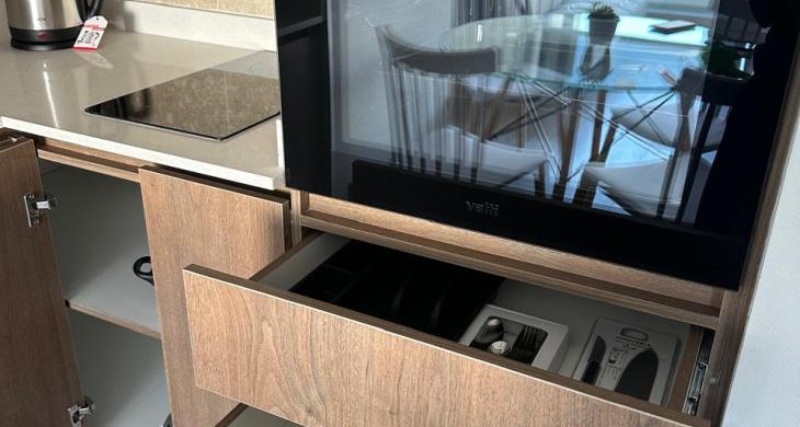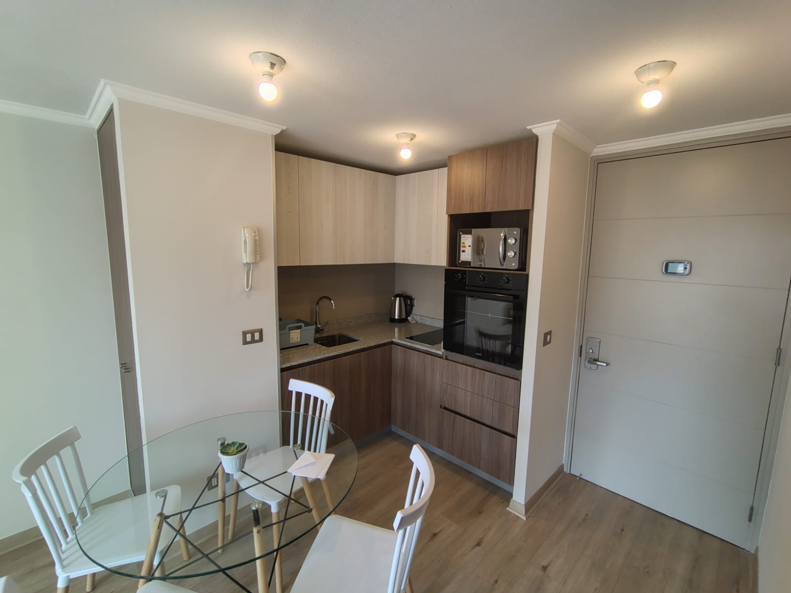 - Cocina americana con encimera de vitrocerámica, campana y horno, microondas, refrigerador.