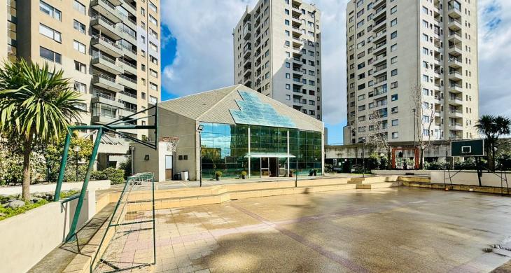 Ubicado en el Edificio Plaza Mayor II, este departamento le espera con un iluminado y espacioso Living Comedor, cocina amoblada, loggia con instalacion para lavadora y secadora, 3 dormitorios, incluyendo un en suite, y 2 baños, Ventanas termopanel y piso flotante en todas las habitaciones. Aquí podrás disfrutar de preciosos jardines, piscina exterior, gimnasio, salón de eventos, sala de reuniones, sala de estudio, cancha de baskettball, ideal para familias o profesionales que buscan espacio y confort. Además, cuenta con 1 estacionamiento subterraneo y 1 bodega, brindándole soluciones prácticas para su día a día.