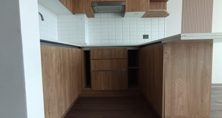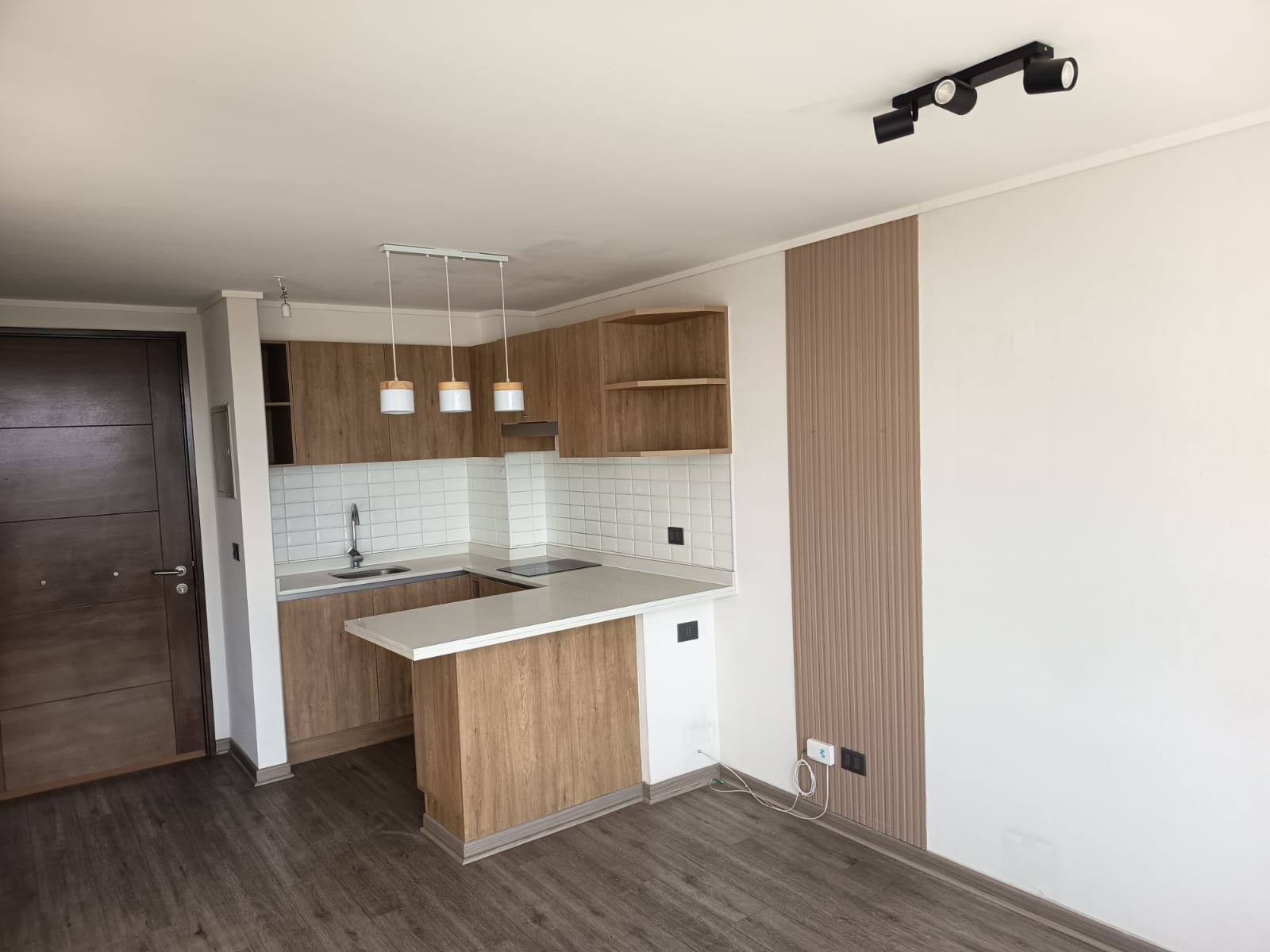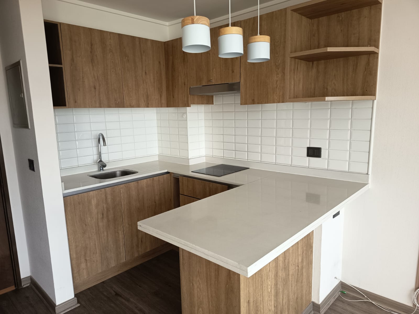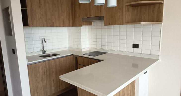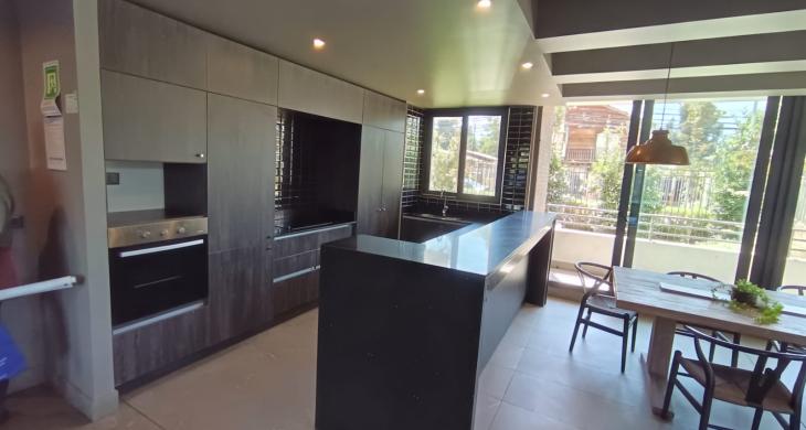 Cocina integrada y equipada con encimera vitrocerámica, campana, horno empotrado, mesón con cubierta de cuarzo. Muebles de madera que hacen una cocina acogedora.