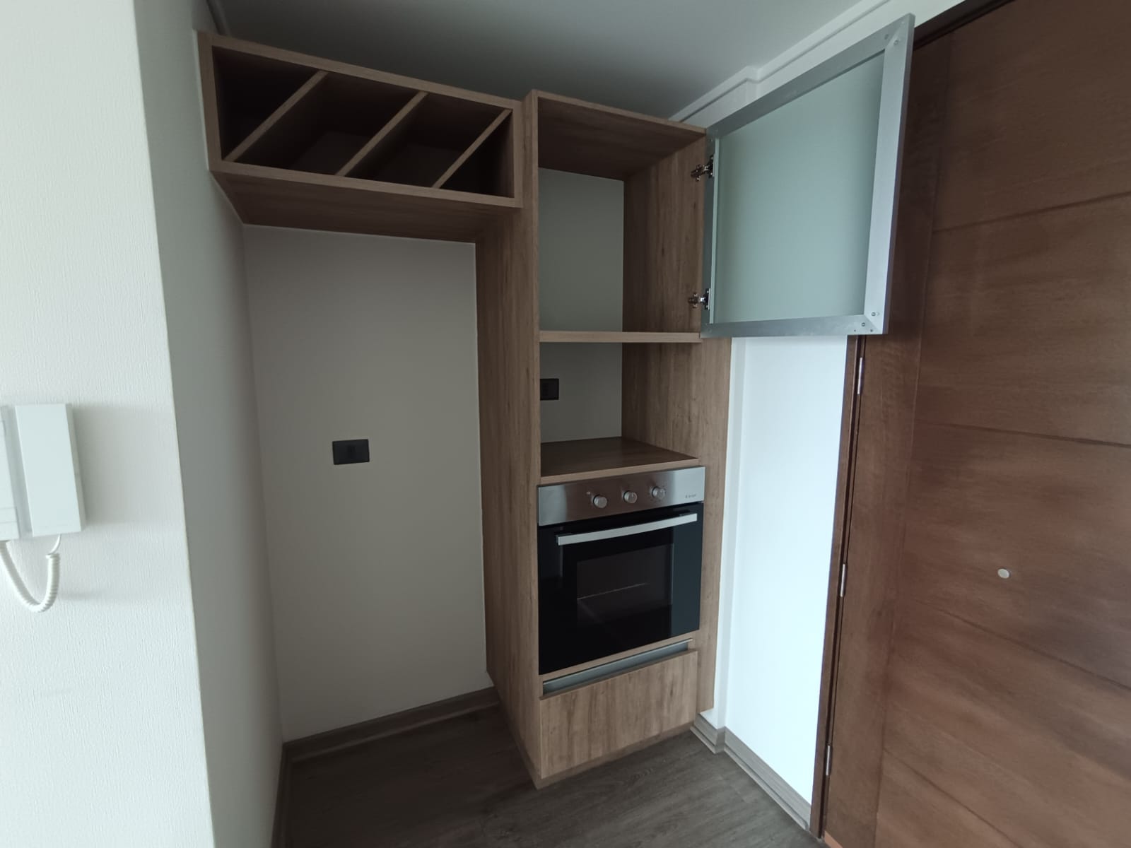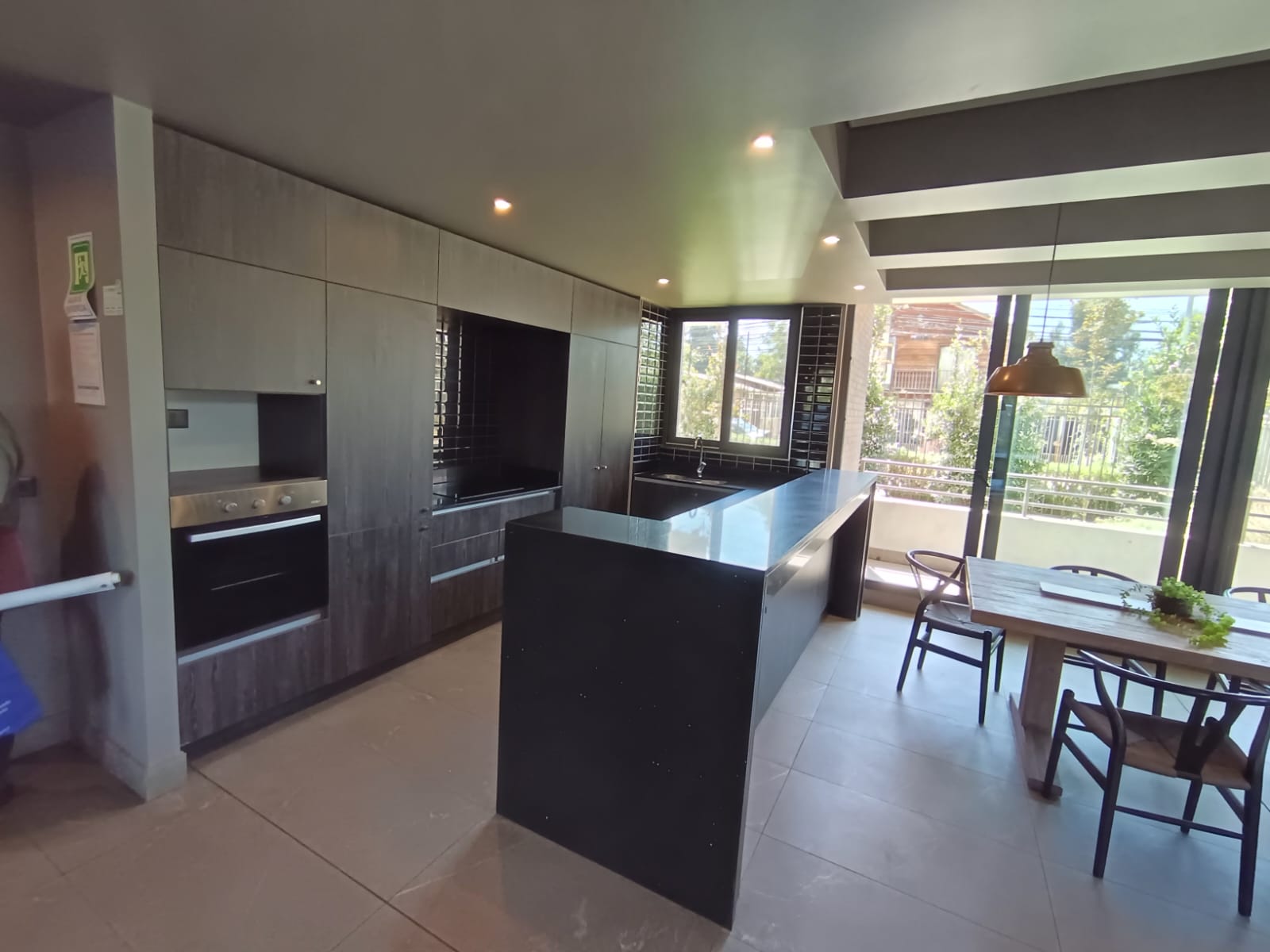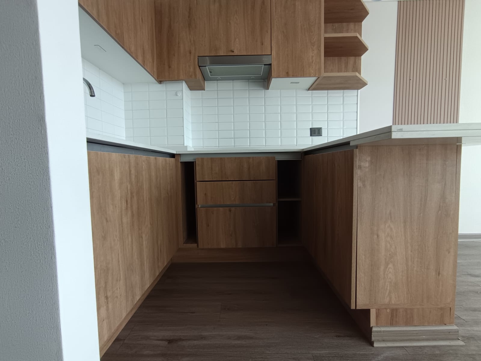 Cocina integrada y equipada con encimera vitrocerámica, campana, horno empotrado, mesón con cubierta de cuarzo. Muebles de madera que hacen una cocina acogedora.