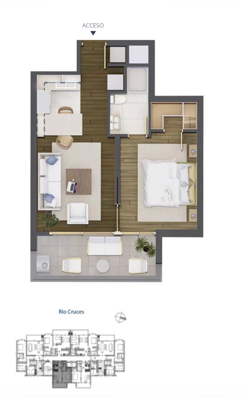 ISA CORRETAJES Arrienda departamento en Condominio Riberas del Cruces, ubicado en Isla Teja. Cuenta con 1 dormitorios en suite y 1 baño. Cocina incorporada con encimera vitrocerámica y horno eléctrico. Comedor de diario. Calefacción central por caldera a petróleo. Living con acceso a terraza. Estacionamiento y bodega.