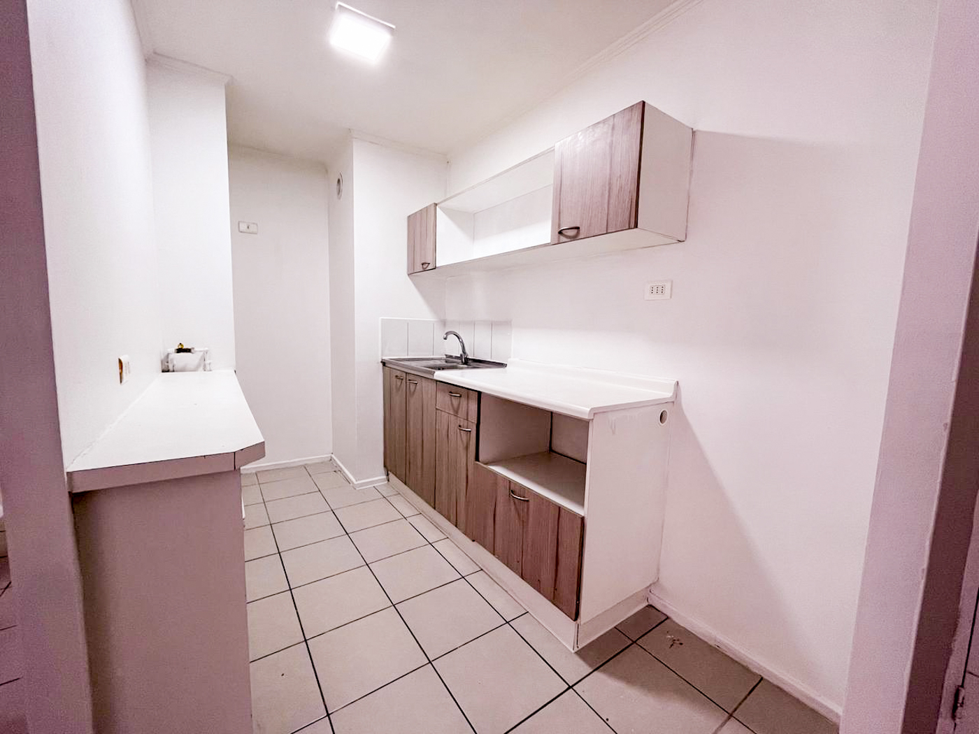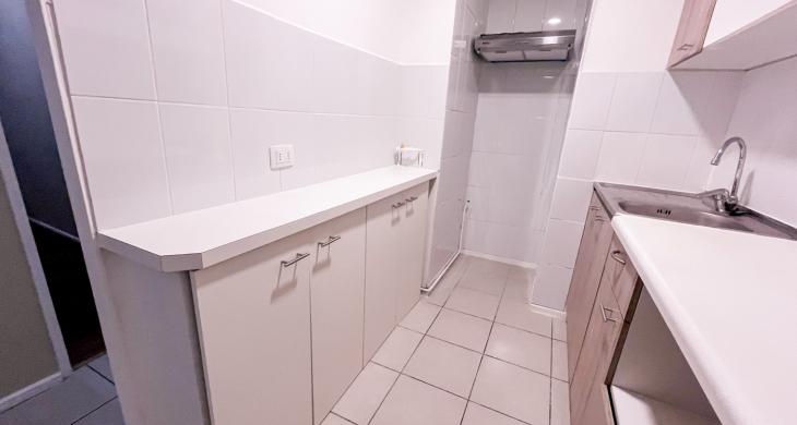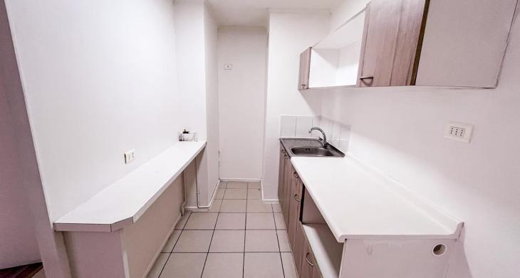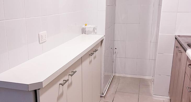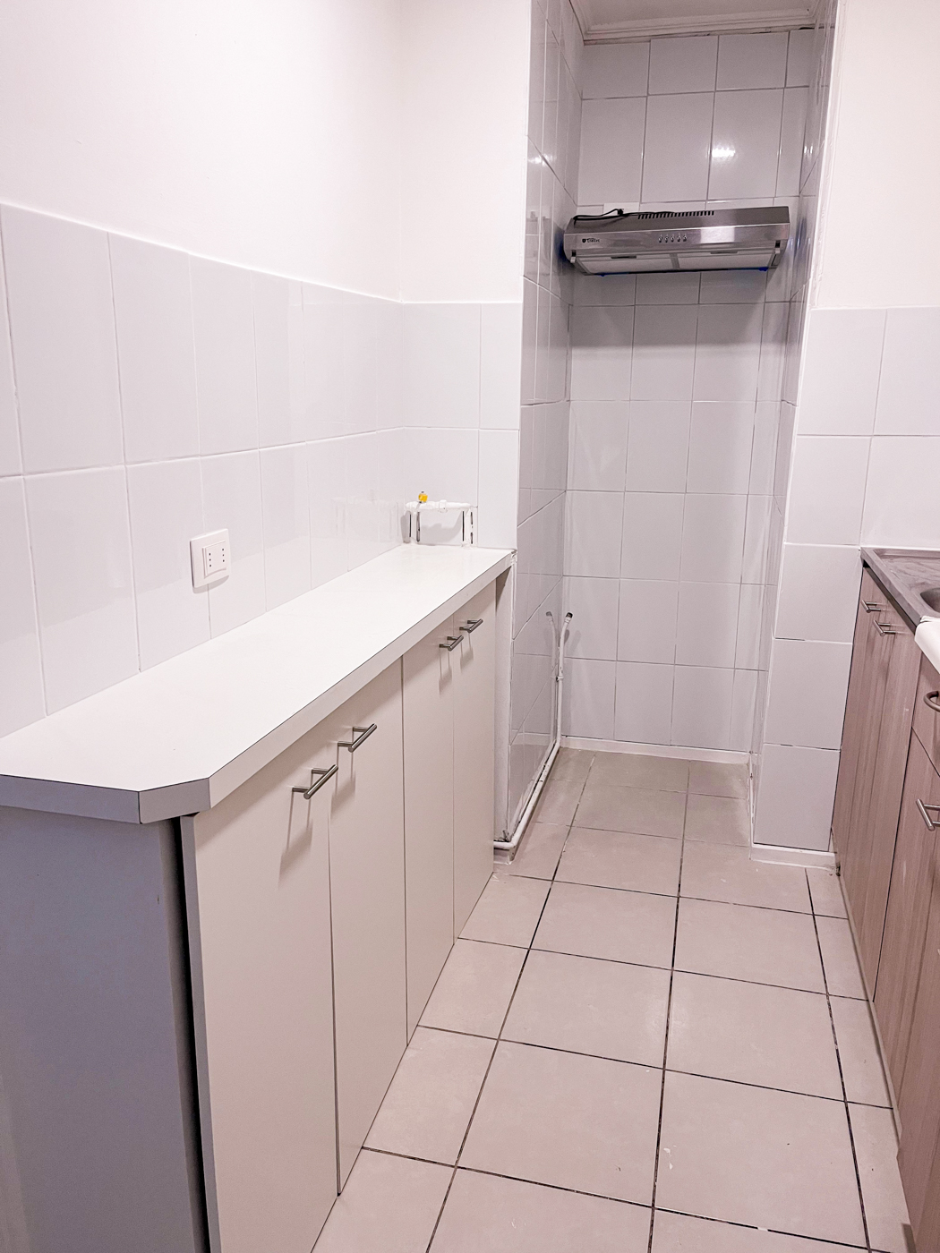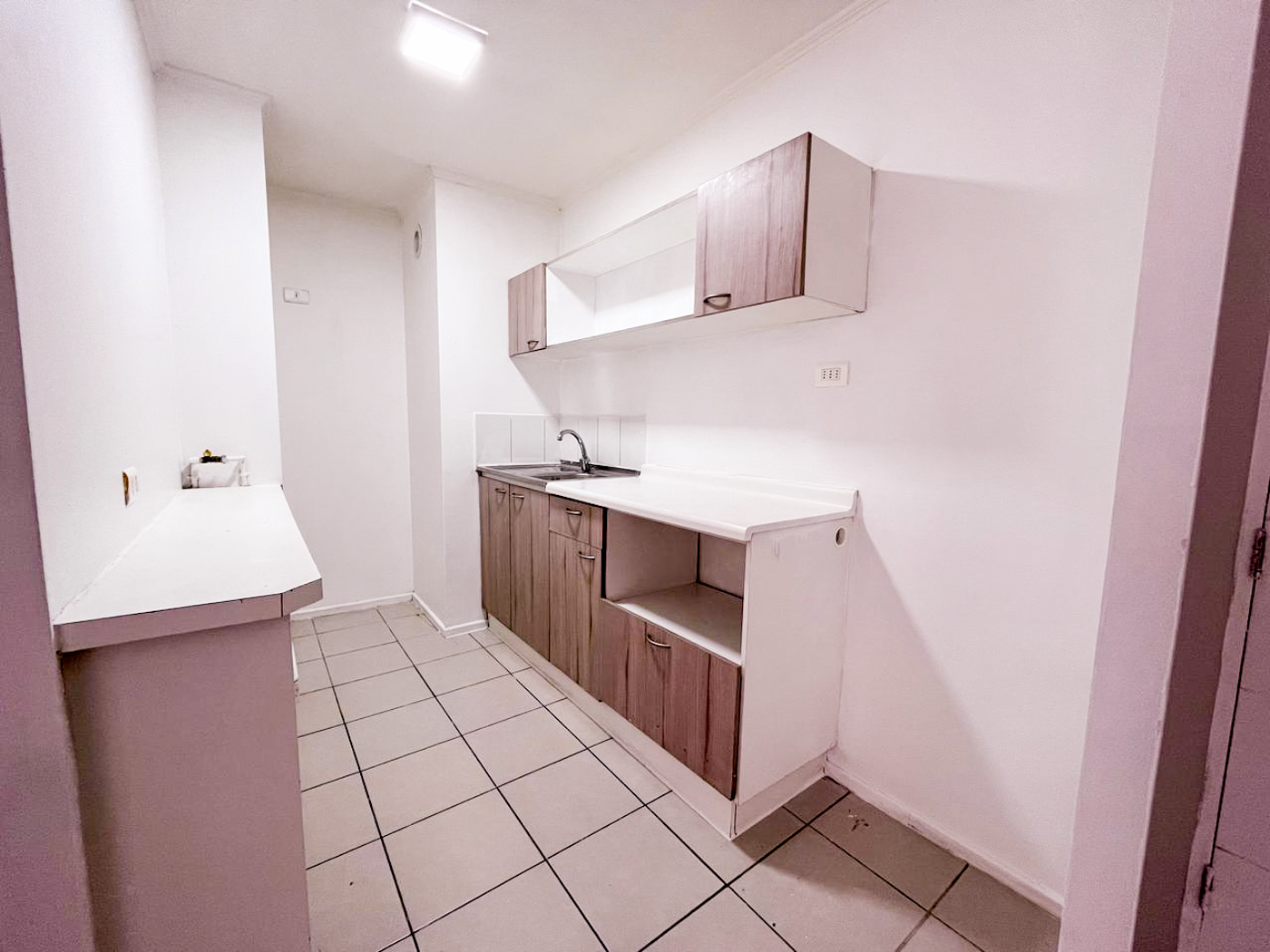 Actualmente el departamento cuenta con campana en la cocina y cerámica por las paredes de ésta para hacer más fácil la limpieza. Además se incorporó un mueble en el mesón de la cocina para tener más espacio donde guardar mercadería o lo que se estime necesario. También se instalaron rieles con focos en el living comedor.