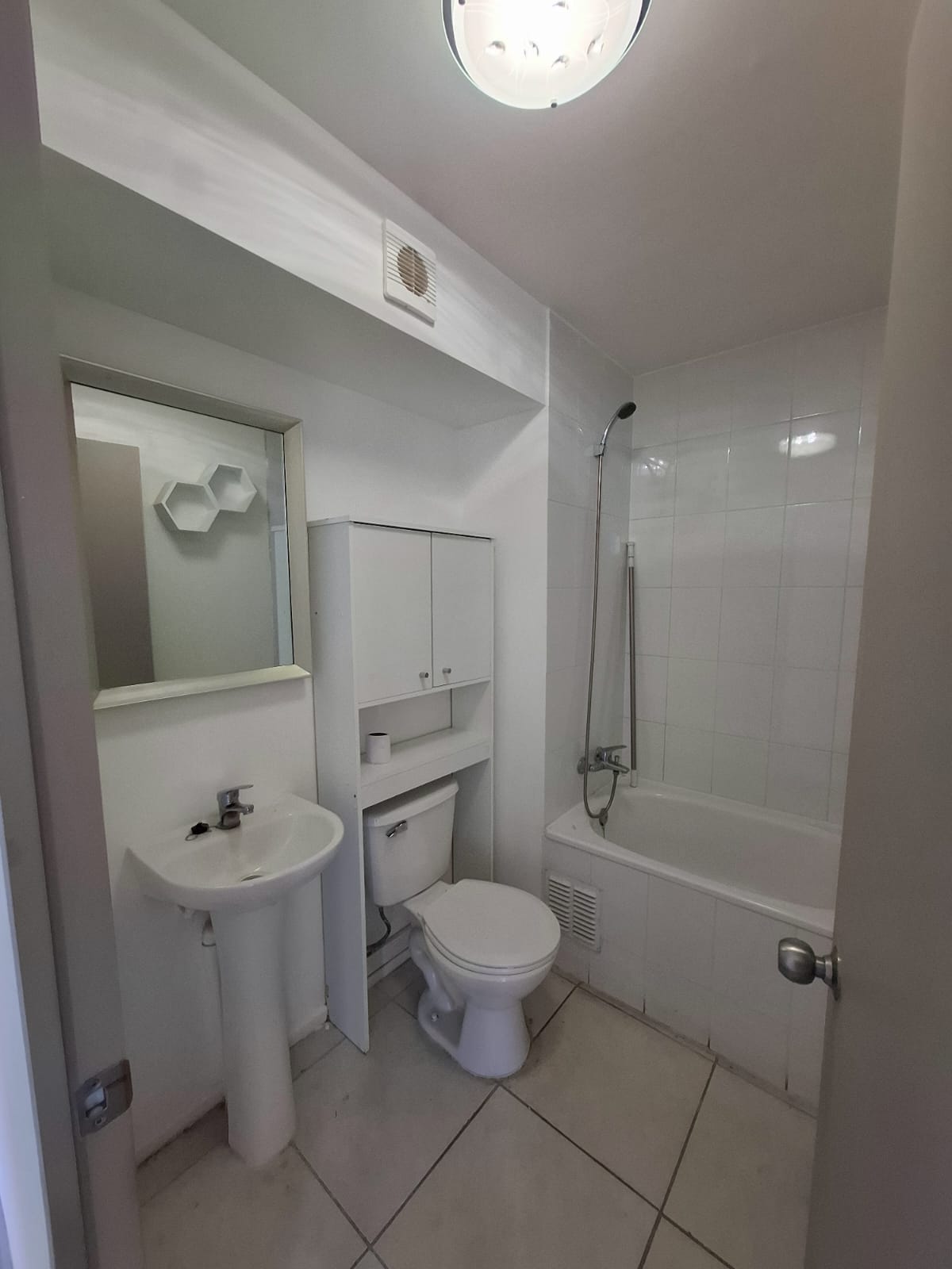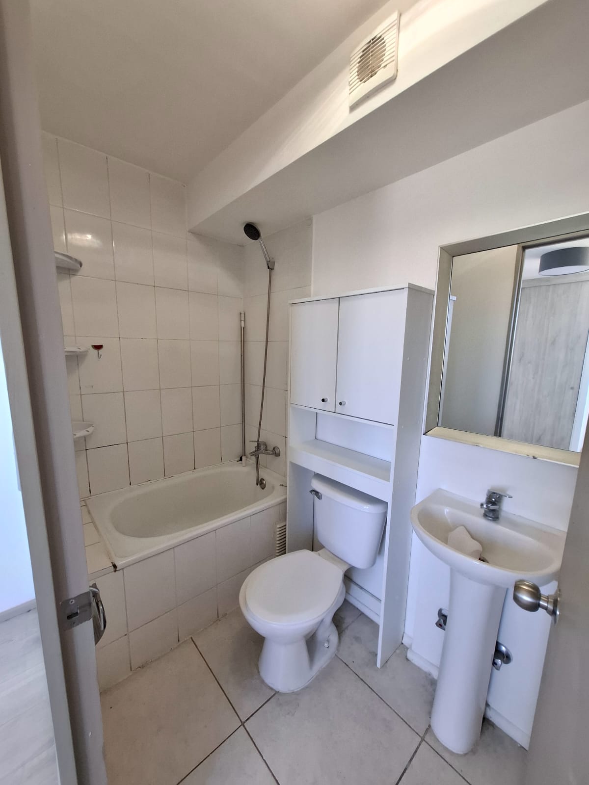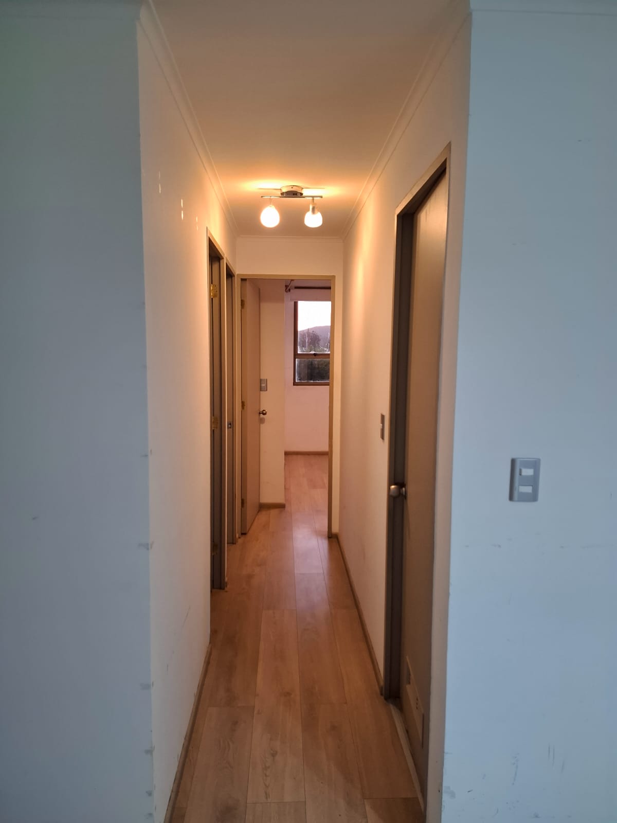 Piso flotante en todo el departamento, cerámico en baños y cocina.