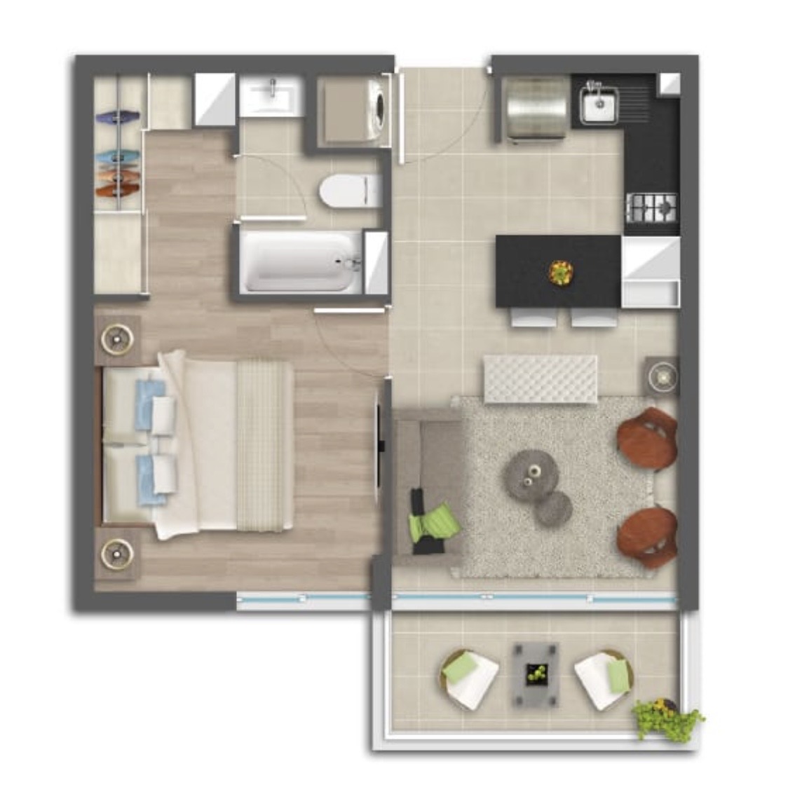 Este moderno departamento de 43 m² ofrece un dormitorio en suite, un baño completo y un estacionamiento, ideal para solteros o parejas que buscan un espacio funcional y con estilo. Ubicado en el piso 12, este departamento cuenta con una bodega para almacenamiento adicional.