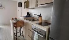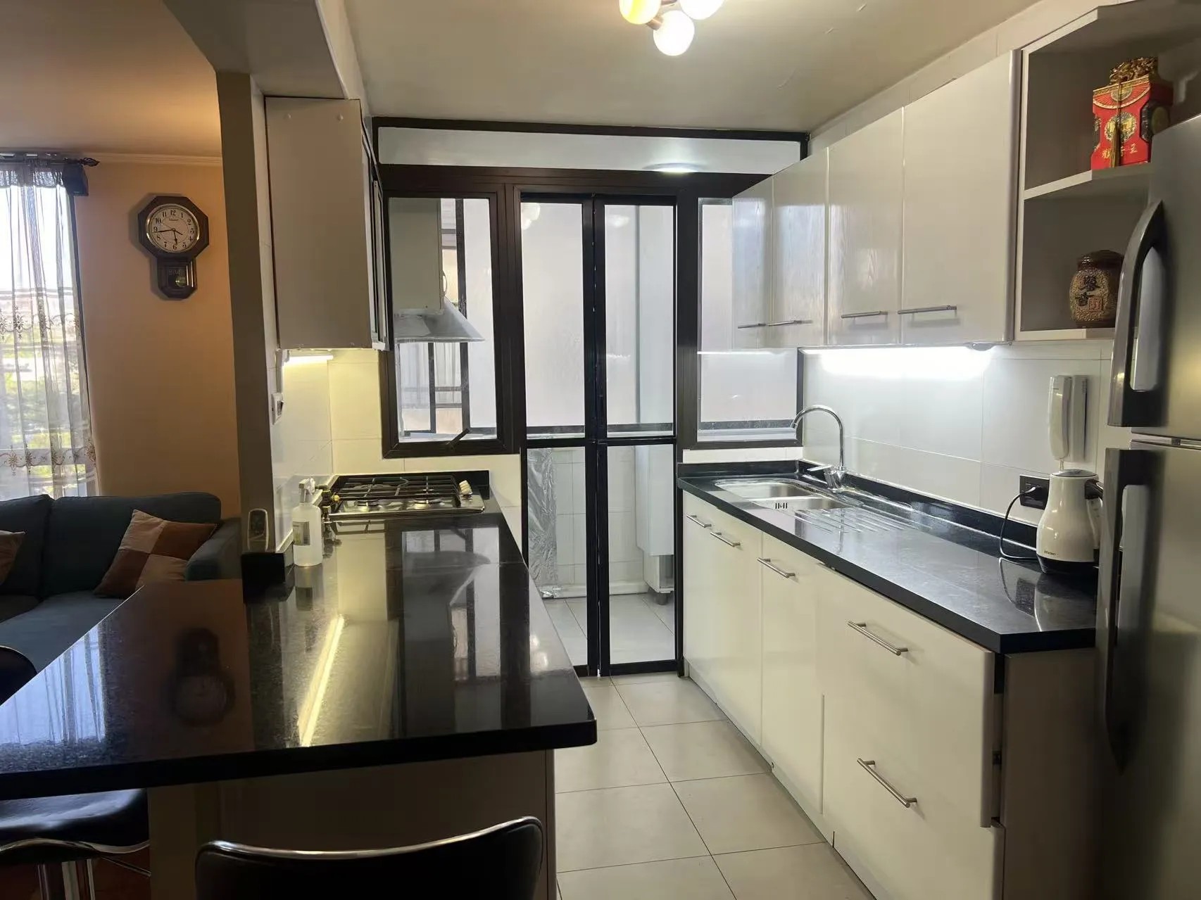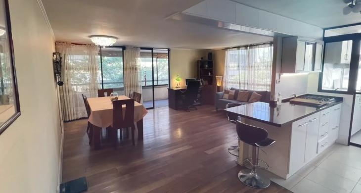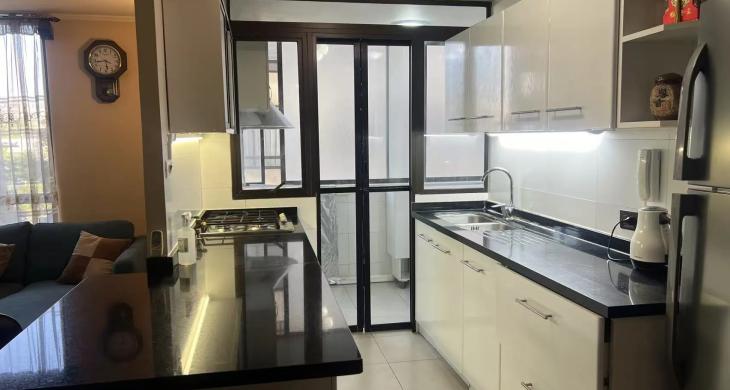 Cocina cerrada que se modifico incorporando mayor conexión a la sala, amoblada y equipada con buenos muebles y encimera cuatro platos, horno, campana, doble lavaplatos. Cuenta con logia , muy buena ventilación.
