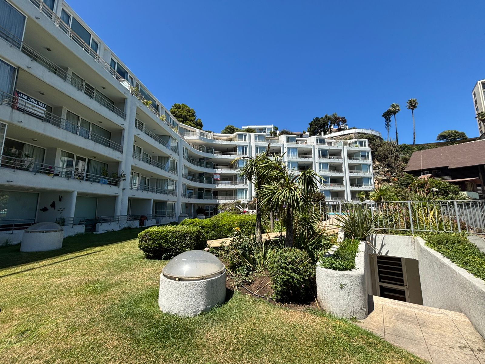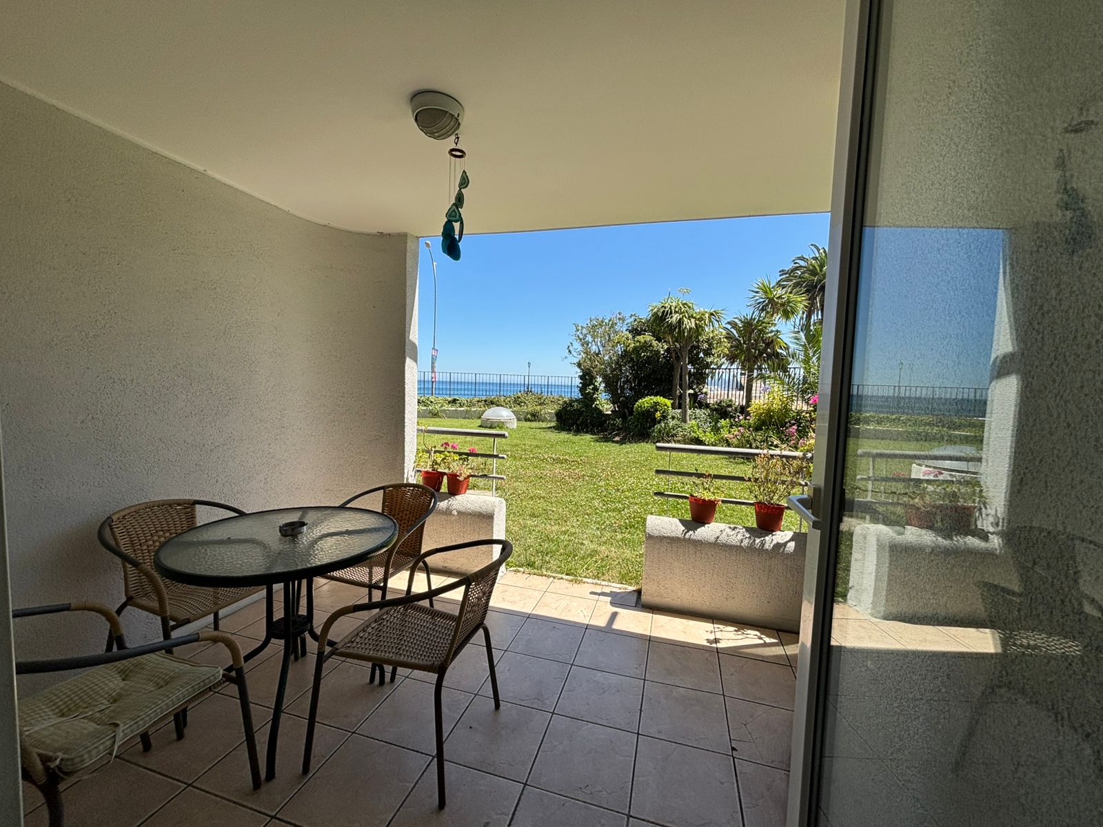 Terraza con acceso directo a los amplios jardines del condominio, y a pasos de la piscina con vista panorámica.