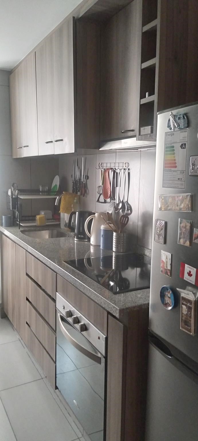 Cocina tradicional, amoblada y equipada con encimera, campana, horno, mesones de granito, cuenta con logia, muy buena ventilación.