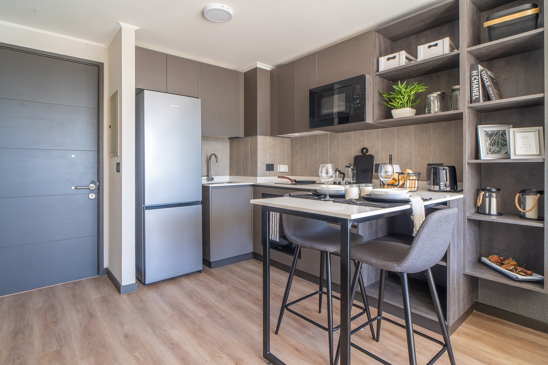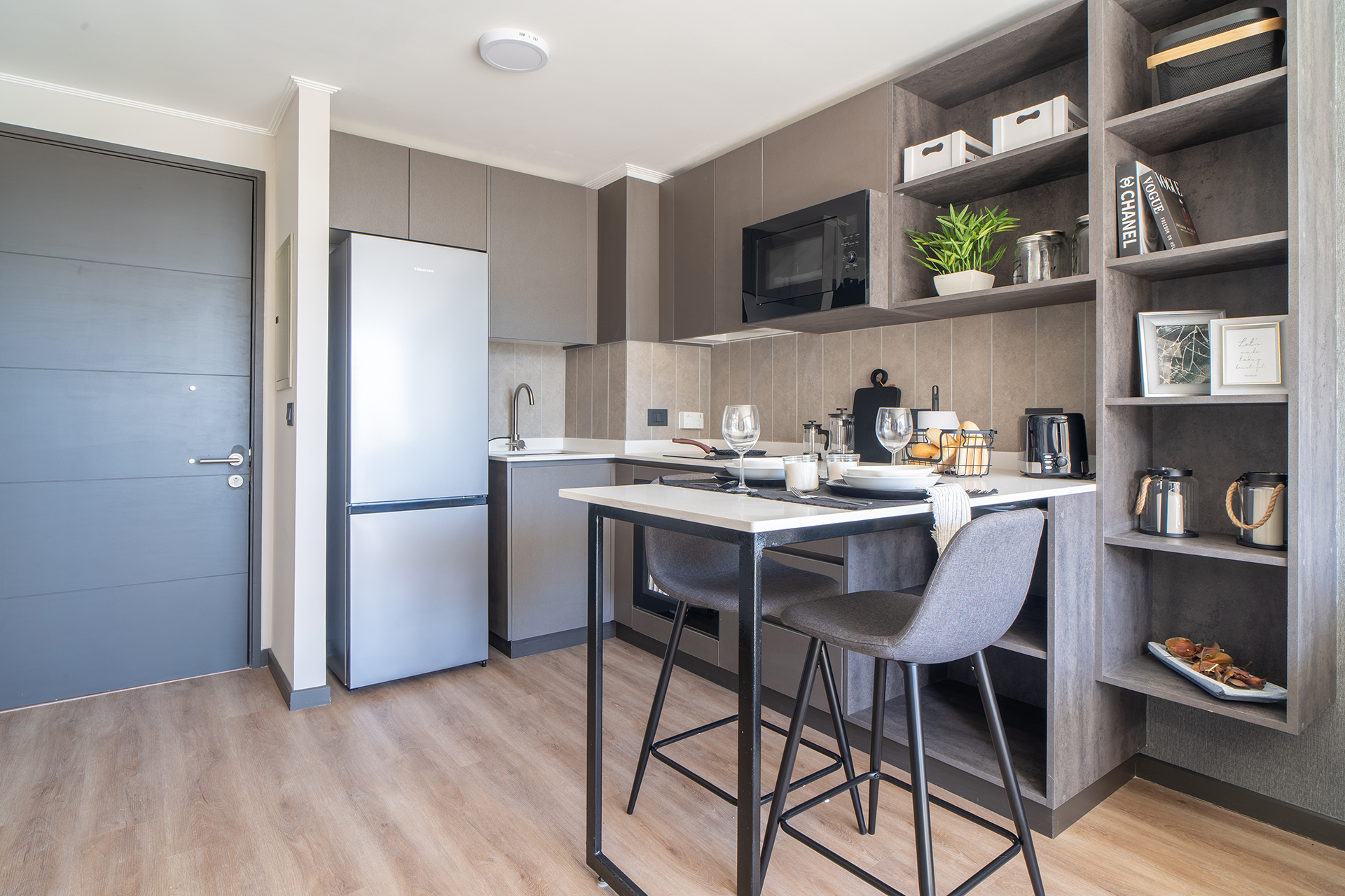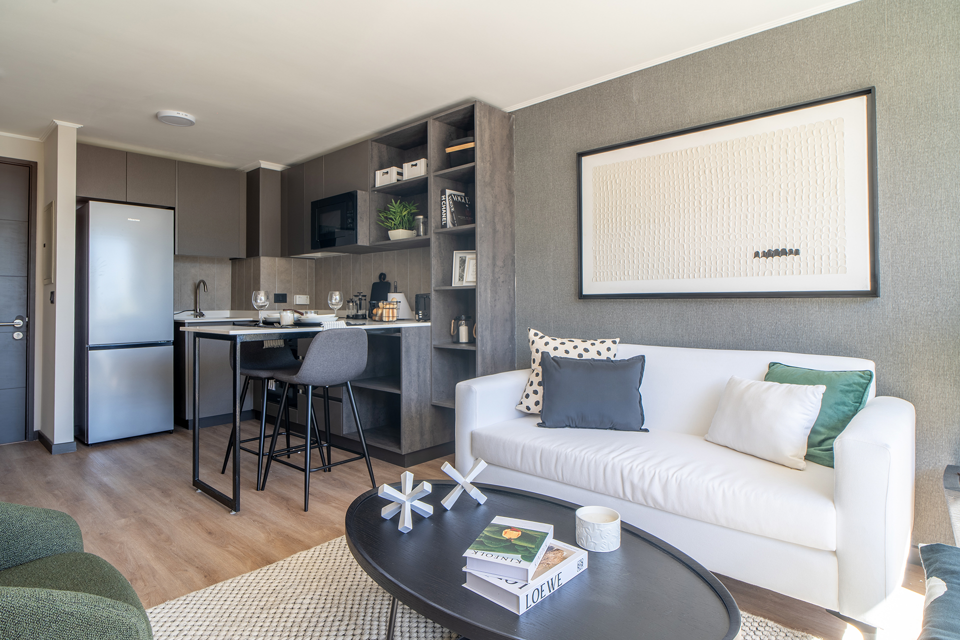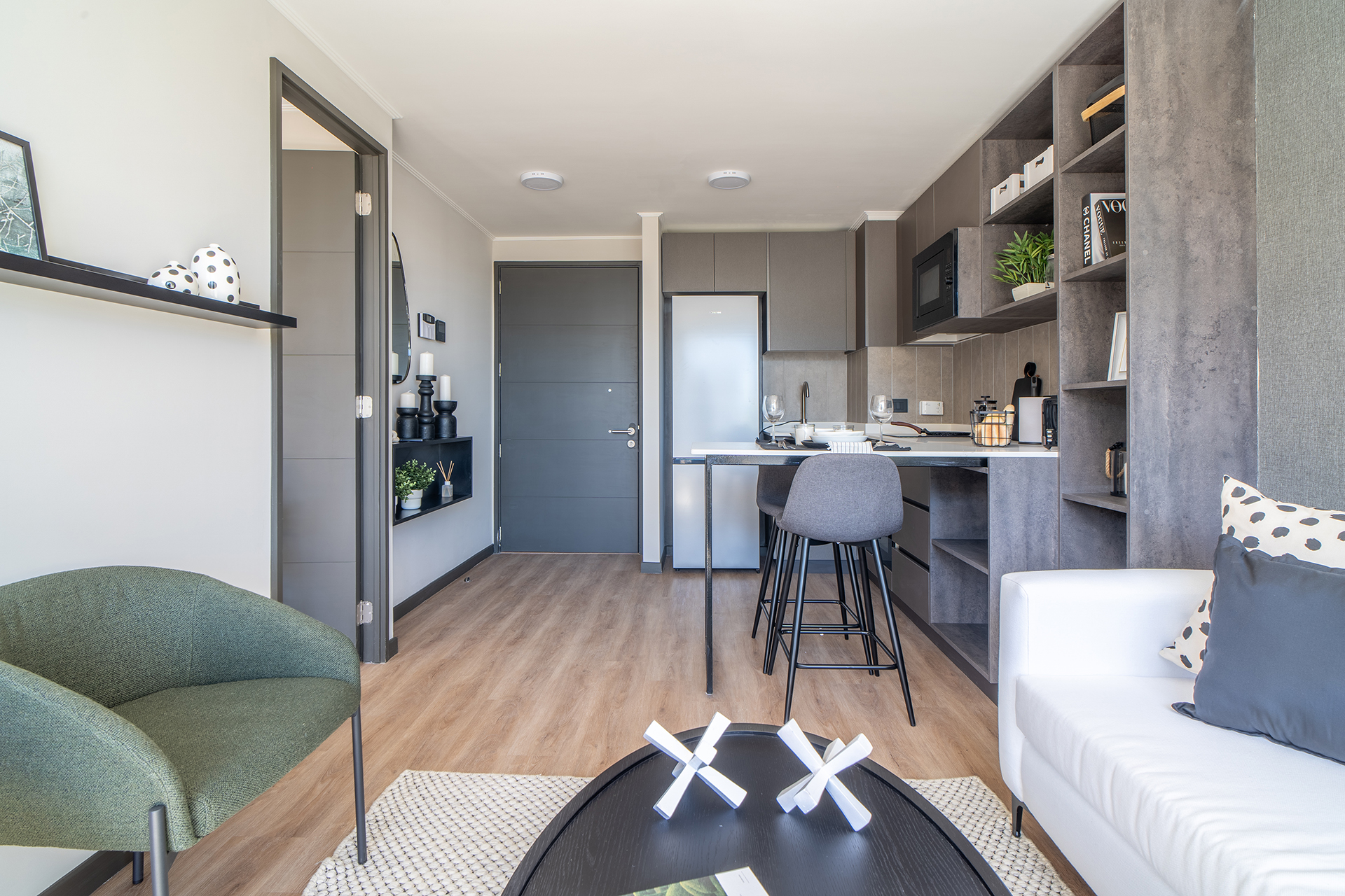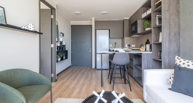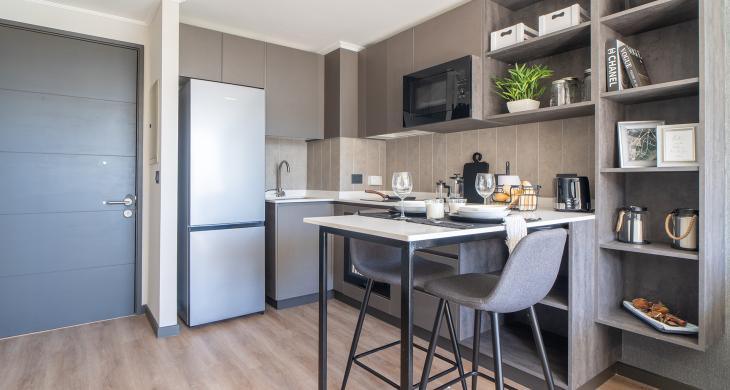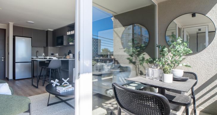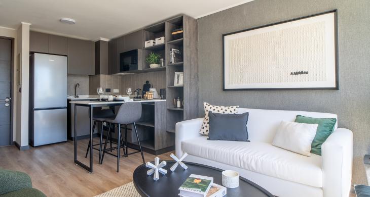 Como parte de un proyecto de vanguardia con fecha de entrega estimada para el primer semestre de 2026, esta unidad representa una excelente opción tanto para vivir como para el mercado de arriendos. El edificio prioriza la protección de sus residentes, incorporando un sistema de seguridad avanzado con vigilancia las 24 horas del día, garantizando un entorno seguro y tranquilo en todo momento. La arquitectura del departamento ha sido pensada para optimizar la entrada de luz natural, creando ambientes acogedores que se adaptan a las necesidades del profesional moderno o parejas que buscan su primer hogar.