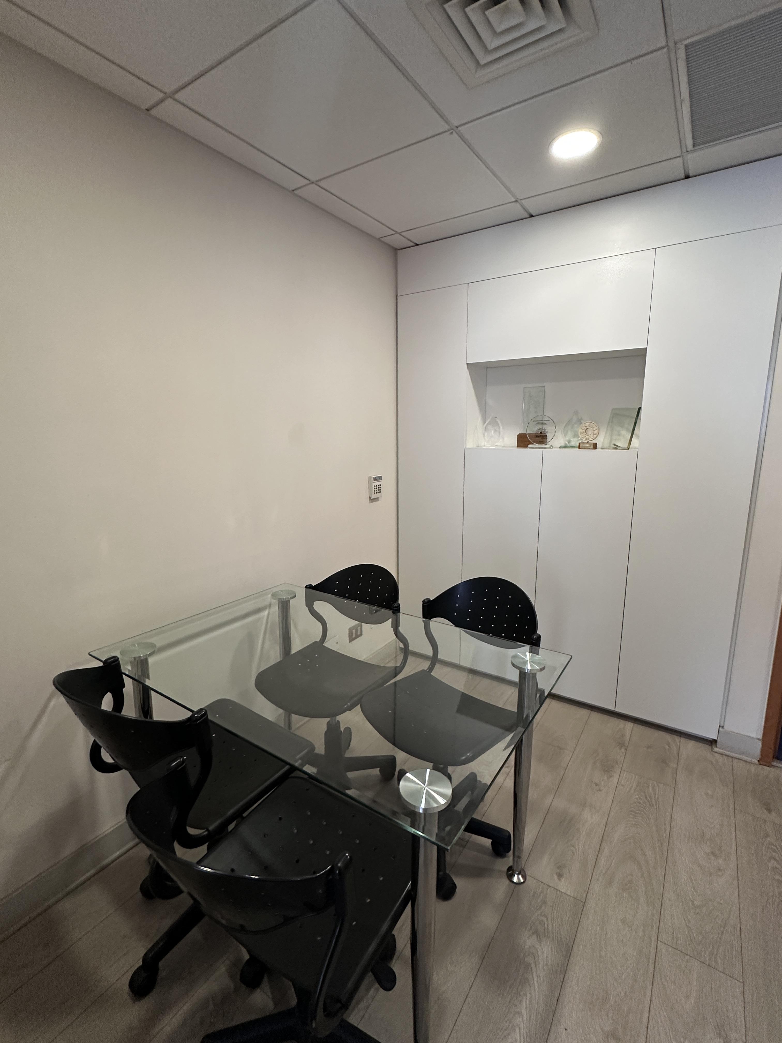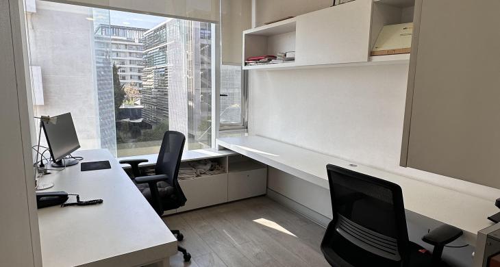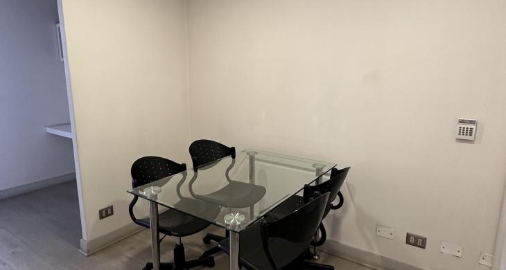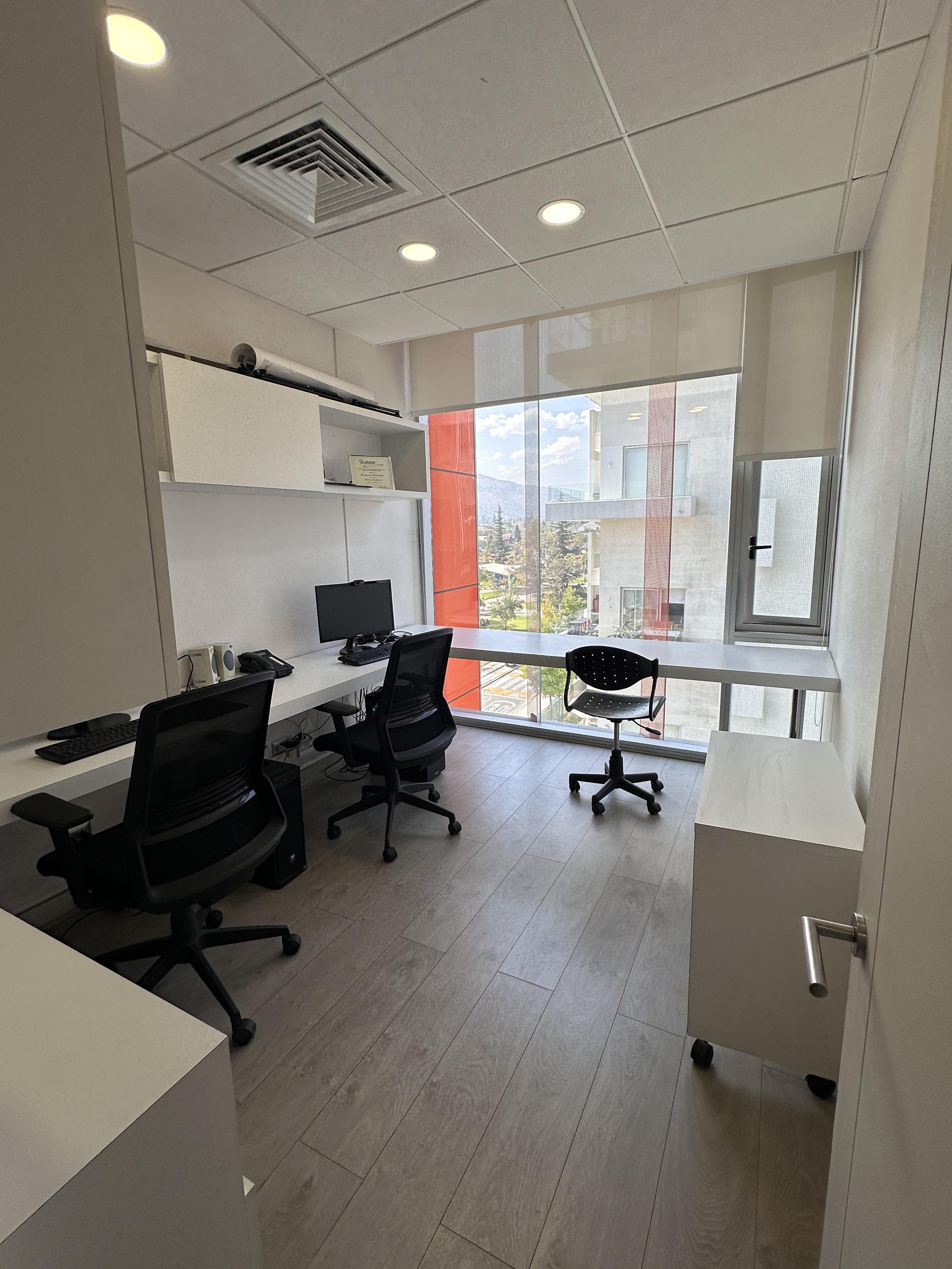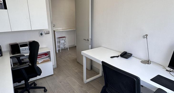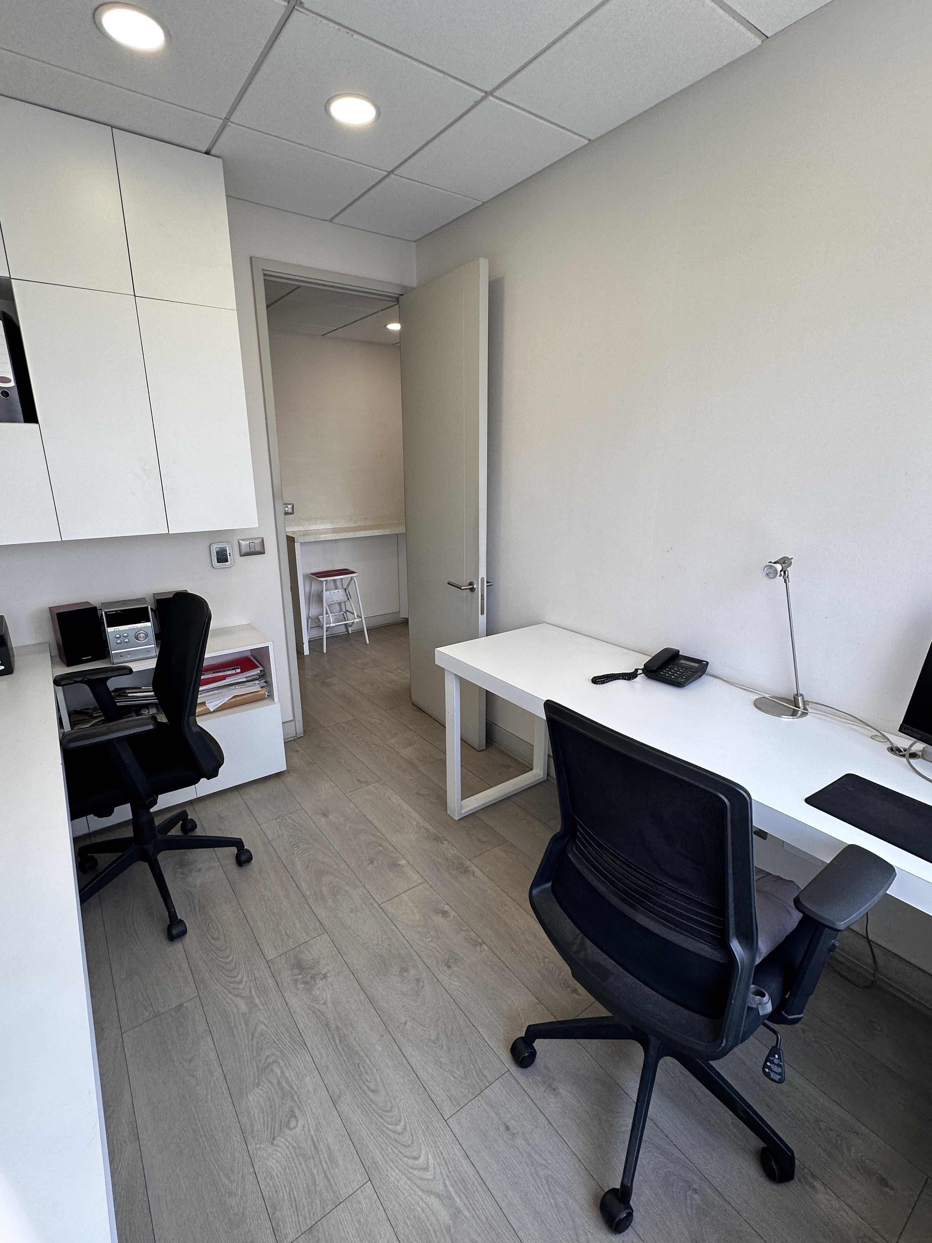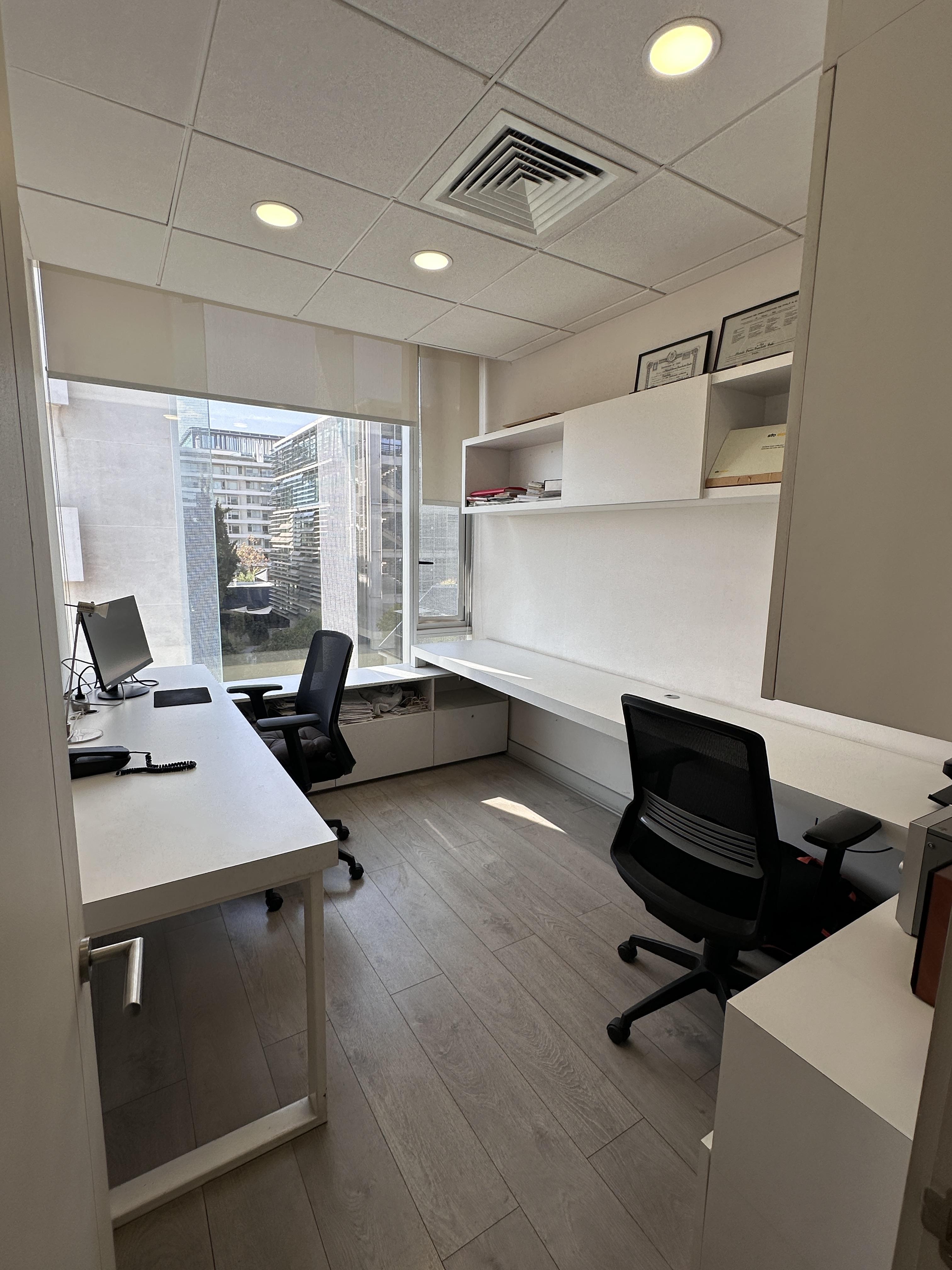 La oficina se encuentra completamente amoblada con estanterías, escritorios, closets en todos los espacios, sillas de escritorio, etc. Cuenta con espacio para recepción, dos privados con escritorios y muebles listos para utilizar, kitchenette con microondas, frigobar, lavaplatos. La oficina cuenta con un baño. Vista Oriente. Sistema de climatización tanto como aire acondicionado como calefacción.